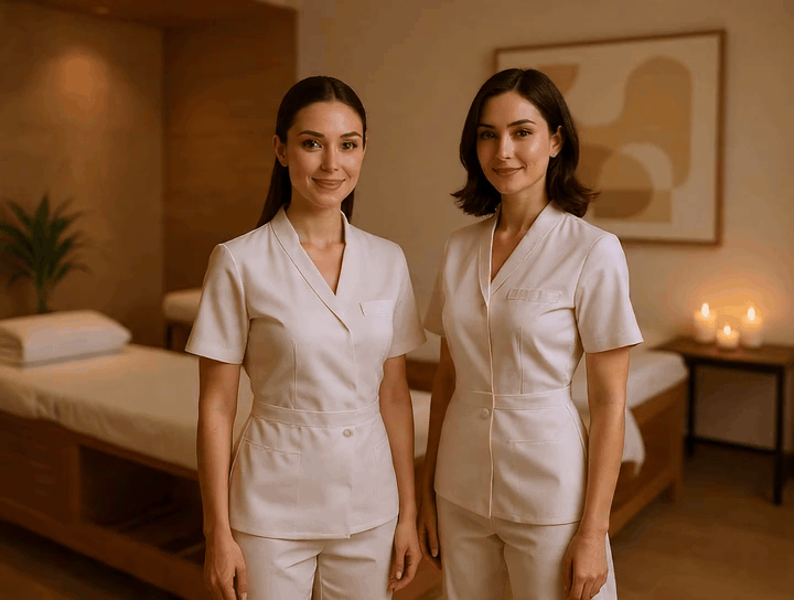 Dos especialistas mujeres, expertas en bienestar masculino, le guiarán en un viaje de desconexión total. Ataviadas con uniformes perla claro que reflejan nuestra pulcritud, aplican técnicas avanzadas en una suite privada de ambiente sofisticado.